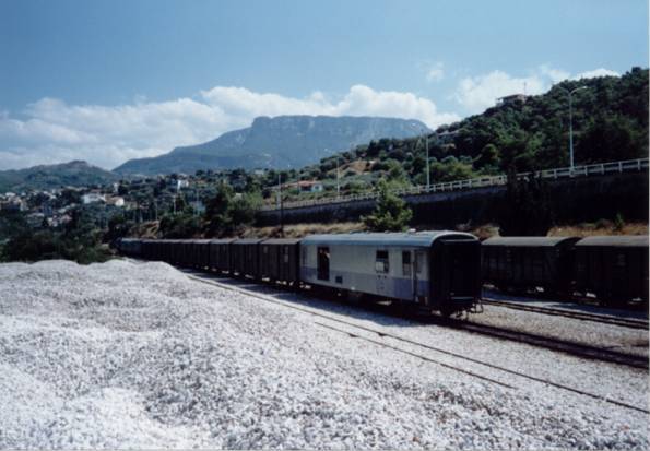 French engine leaving Platanos station.Lot's of gravel huh?!Wish they used it for maintenance....